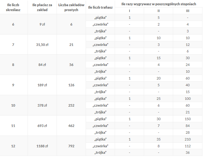 Dokładne informacje o poszczególnych systemach, kosztach, liczbie zakładów prostych i wygranych przedstawia tabela systemowa Mini Lotto. Za jej pomocą można sprawdzić dokładną cenę zakładów ze skreślonymi liczbami od 6 do 12 spośród 42.